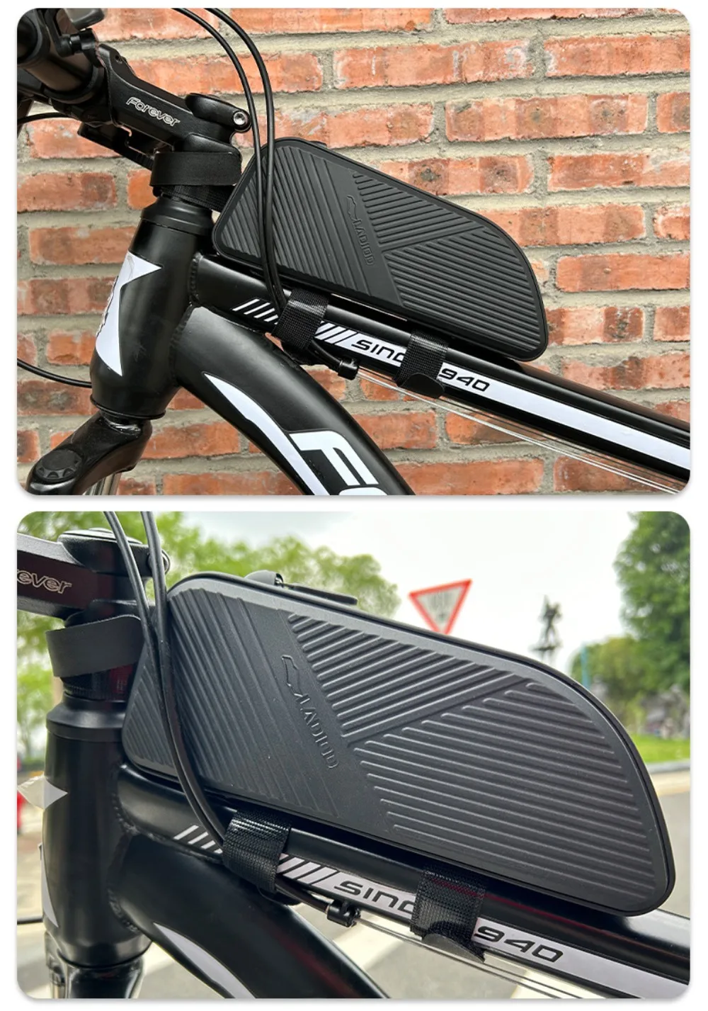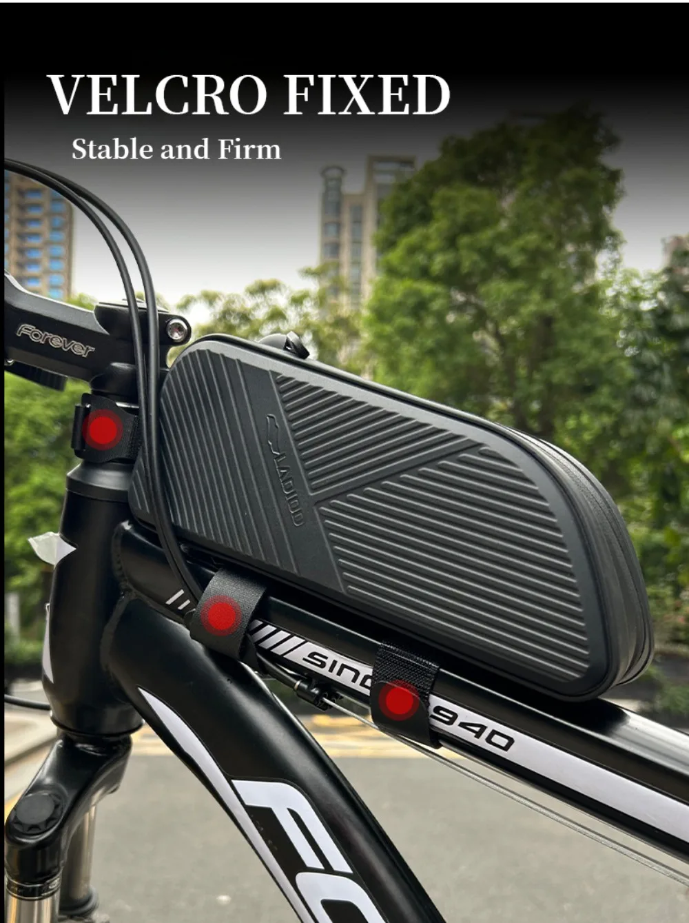 Stable & Anti-Attrition: We are using three adjust rail systems to keep the bag in place. The straps are long enough to snug it down tight against the front tube and top tube. They are made of non-slip soft leather to reduce friction on the bike tube.