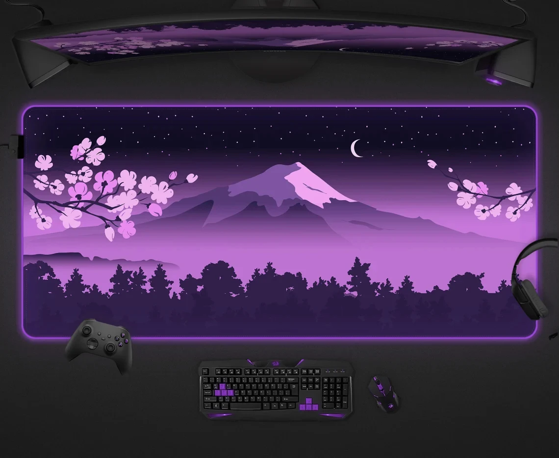 Purple Mouse Pad RGB Fuji Desk Mat Gaming Mousepad Japanese Night Pink Black Mountain Landscape XXL Large LED RGB Gaming Deskmat