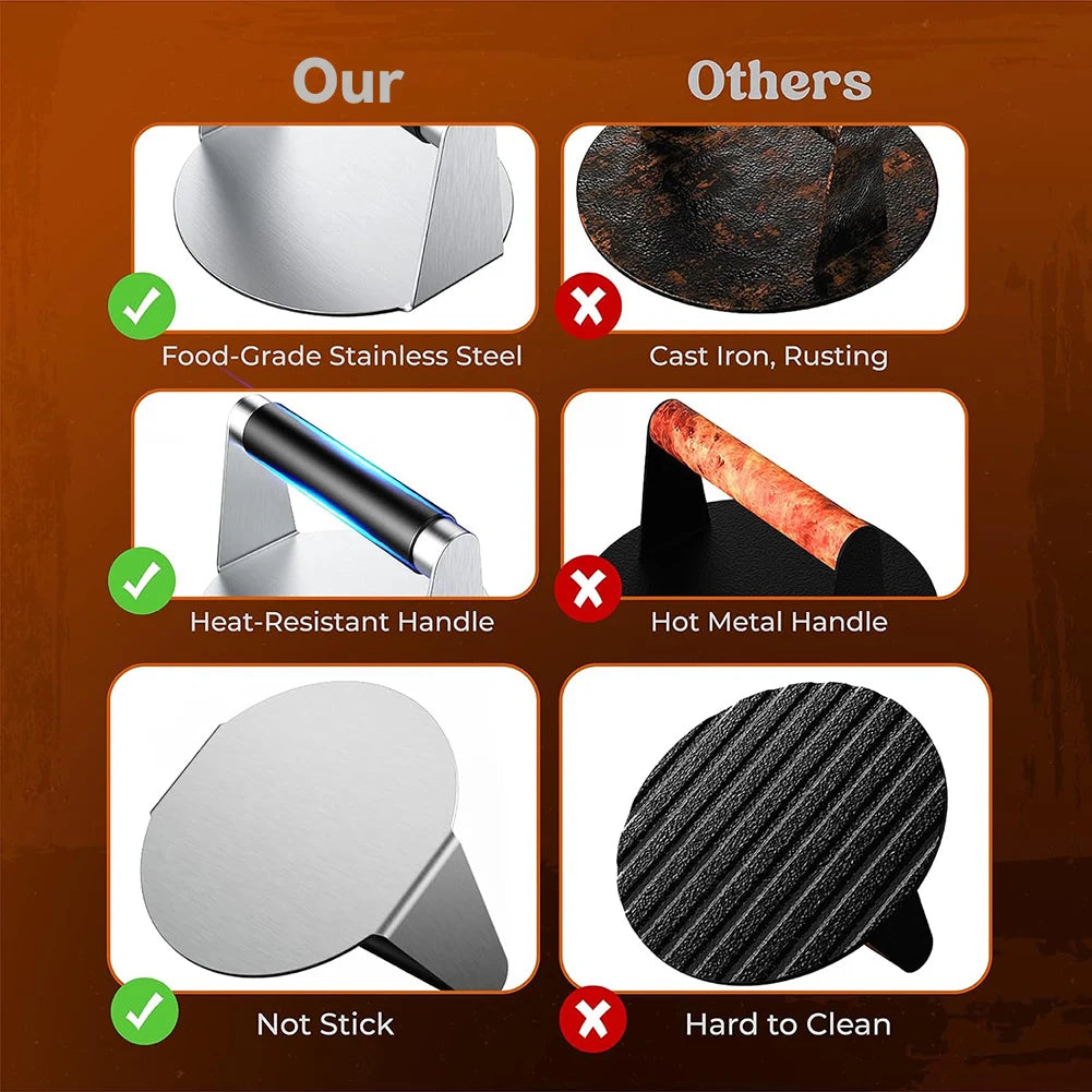 Perfect Burger Partner: The Burger Smasher helps cook meats more efficiently, pressing out excess fat and oil for healthier cooking. It reduces cooking time and enhances flavor, allowing you to cook juicy patties with crispy edges like a professional chef.